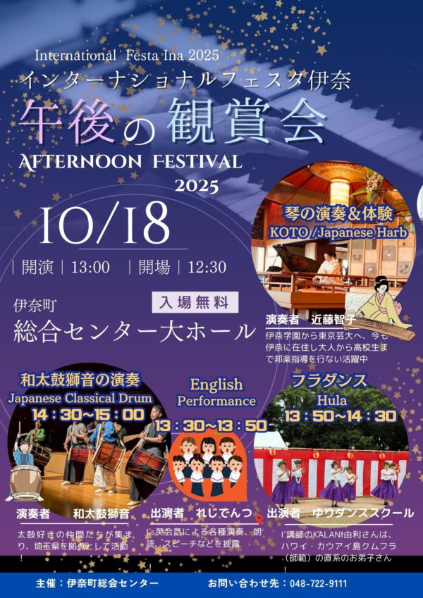 インターナショナルフェスタin伊奈(2025年10月18日)個別催し紹介 新規 / 継続新規開始日時2025年10月18日回数1回 伊奈町役場のHPもご参照ください。 今年も「インターナショナルフェスタinいな」を開催します! | バラのまち埼玉県伊奈町公式ホームページ Ina Town Official Web site