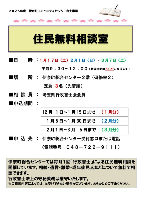 住民無料相談室(2026年1~3月)