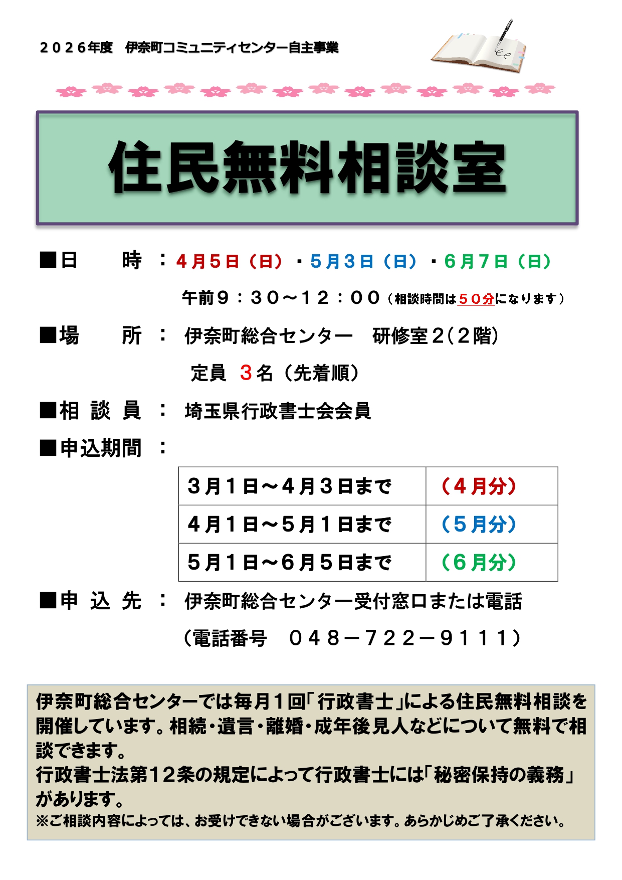 住民無料相談室(2026年4~6月)
