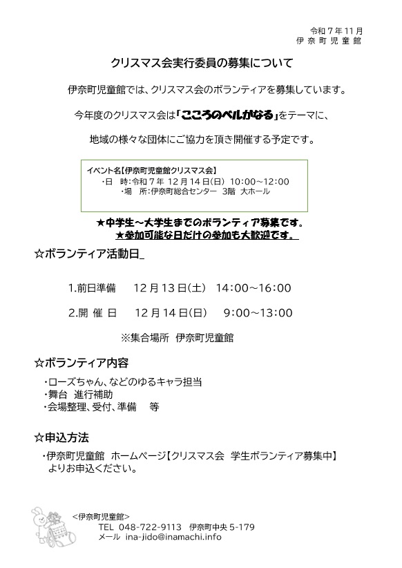 ★クリスマス会 学生ボランティア募集中(中・高・大学生) 新規 / 継続新規開始日時12/14(日) <申込方法> 応募フォームからお申し込みください クリスマス会 学生ボランティア ご不明な点は伊奈町児童館まで 048-722-9113