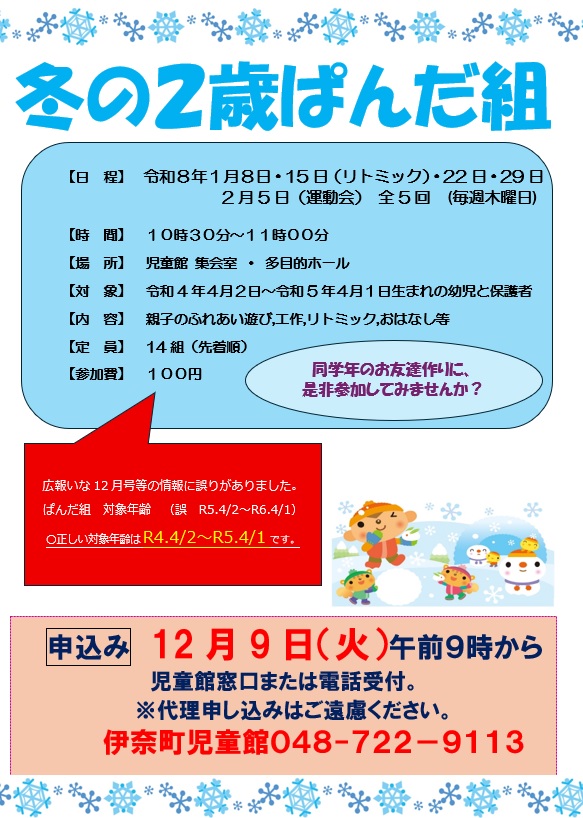 ぱんだ組対象年齢★広報いな12月号訂正のお知らせ 新規 / 継続新規開始日時2025年12月14日(日)回数1回 ぱんだ組対象年齢につきまして 広報いな12月号等の情報に誤りがありました。 ぱんだ組 対象年齢 (誤 R5.4/2~R6.4/1) 〇正しい対象年齢はR4.4/2~R5.4/1です。 受取場所:伊奈町児童館 伊奈町児童館 048-722-9113 埼玉県北足立郡伊奈町中央5-179 開館時間9:00~17:00 休館日:月曜日