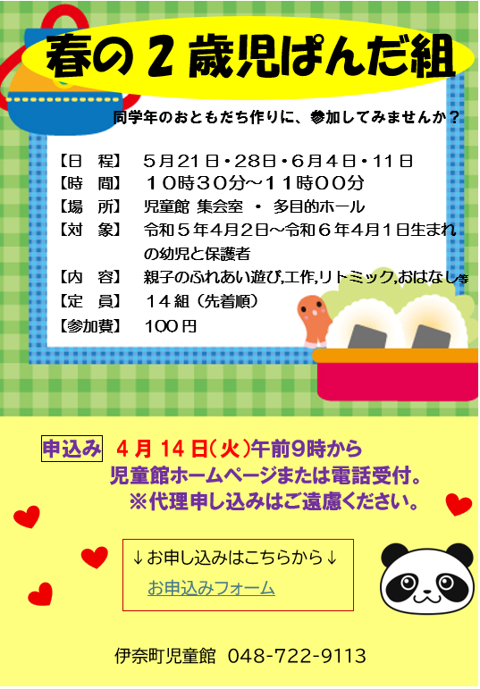 春の2歳児【ぱんだ組】受付中 新規 / 継続継続 ↓春の2歳児ぱんだ組申し込みはこちらから↓ 申し込みフォーム 受取場所:伊奈町児童館 伊奈町児童館 048-722-9113 埼玉県北足立郡伊奈町中央5-179 開館時間9:00~17:00 休館日:月曜日