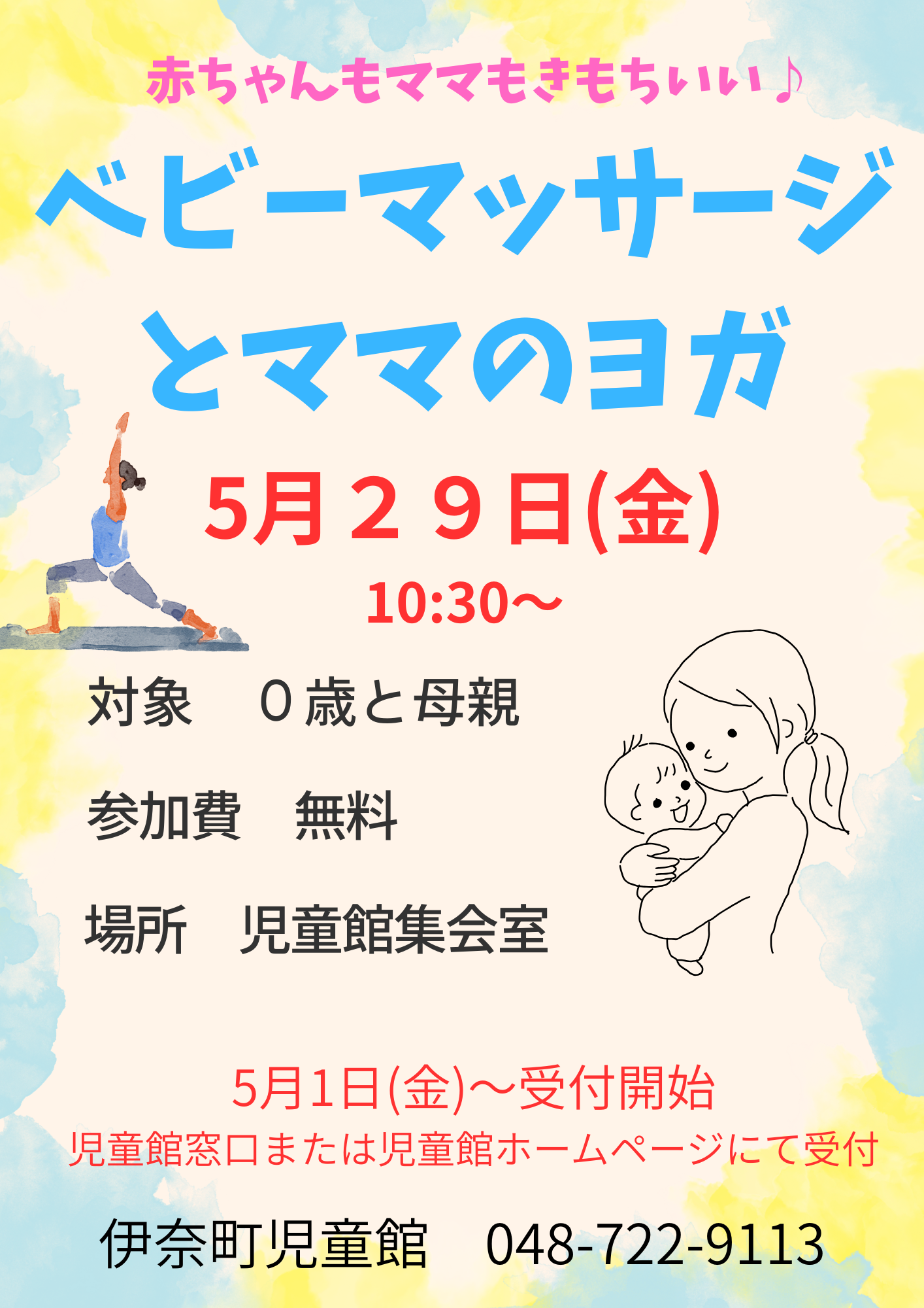 5月ベビーマッサージ♡ママのヨガ 新規 / 継続継続 ↓ベビーマッサージ♡ママのヨガのお申し込みはこちらから↓ 申し込みフォーム 受取場所:伊奈町児童館 伊奈町児童館 048-722-9113 埼玉県北足立郡伊奈町中央5-179 開館時間9:00~17:00 休館日:月曜日